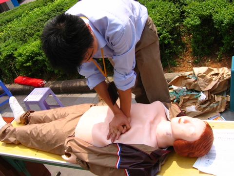 本港訊 5月1日,一位塑料人模正在接受“緊急救護”。當日,省紅字會救護培訓中心工作人員在凱里街頭向市民介紹緊急救護知識,并用人模演示了“成人心肺復蘇術”等緊急救護方法及步驟。