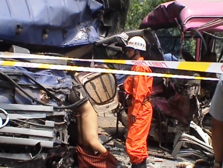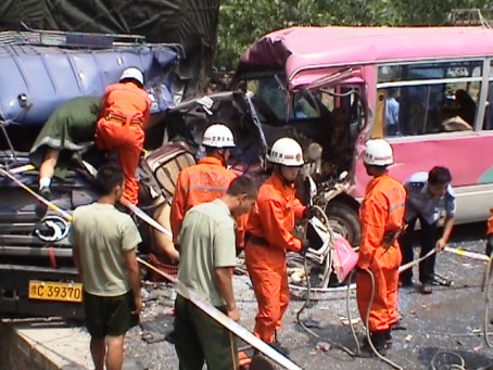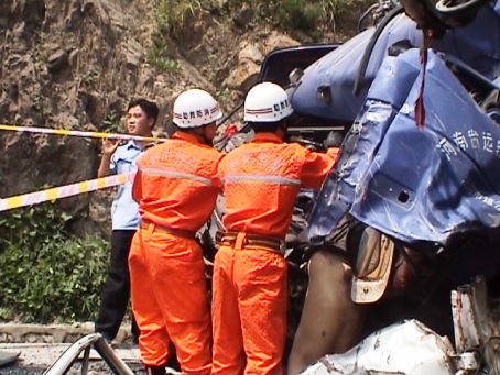下午2時10分,記者隨接到救援請求的凱里消防官兵趕住現場,事發點位于一坡路拐彎處,兩輛肇事車因撞擊猛烈,車頭已稀巴爛,一名死者頭朝下卡在大貨車駕駛室處無法抬出,中巴車內所有座位因劇烈撞擊均已掀翻,車內血斑斑,車外一片狼藉。現場已封鎖,交警、消防、醫院救護人員正有序地控制現場,并將傷員緊急運往凱里。2時30分,經凱里消防隊員動用繩索及液壓鉗等救援工具,最終將在事故中死亡的大貨車司機尸體抬出。