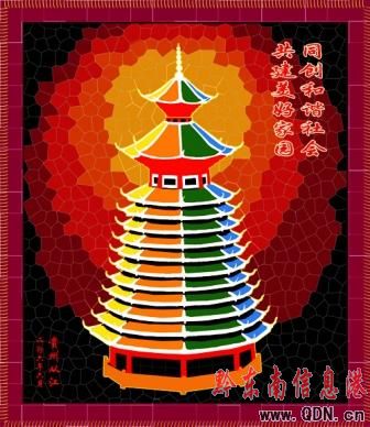 該幅作品以“同創(chuàng)和諧社會(huì)、共建美好家園”為主題,以國家級(jí)文物保護(hù)單位----增沖鼓樓為設(shè)計(jì)藍(lán)本,色彩由分別代表