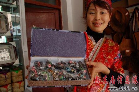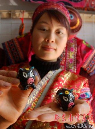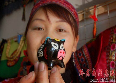 圖:苗族少女在展示小豬泥哨