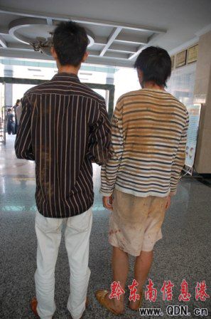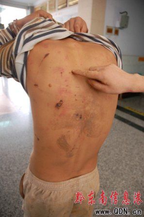 事后,記者在黔東南州醫院見到了兩名遭挾持男子,兩人身上被刀刺、煙頭燙的痕跡觸目驚心,其中一人身上被燙了近百個疤痕和水泡。