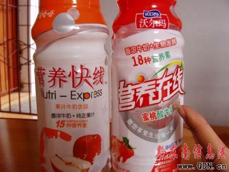 同時,記者還看到,營養快線瓶身標明有15種營養素,而“營養在線”則多了三種,瓶身標明的是18種。在營養成分表中,“營養在線”多出了“維生素 B2 ”和“果汁”,其余的營養成分數據和營養快線顯示的順序和數據一般無二。
