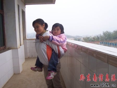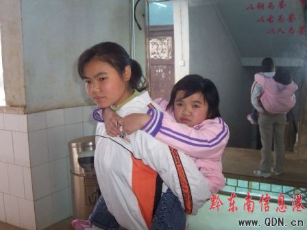這位花季少女叫周小岑,而她背著的是她的姐姐。1998年,她開始這樣背著姐姐上學、放學,有近10年的時間了,從來沒有間斷過。