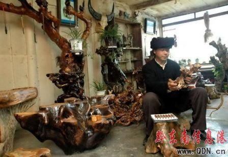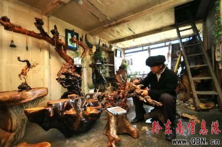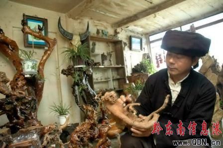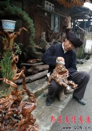 雷山縣丹江鎮羊排村53歲苗族根雕藝人金偉,酷愛根雕藝術,30年來,在農閑里鉆研根雕技藝,利用深山樹木砍伐之后、腐朽、遺棄的千奇百怪樹根,發揮自己非凡的想象力和巧妙的構思,“略微”加以雕琢,使2000多件根雕作品成一件件成為意境深遠、回味無窮的藝術作品,并暢銷省內外,自己家里也因此走上了致富的道路。圖為金偉在家里雕琢根雕作品。(特約記者 陳沛亮 攝 )