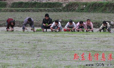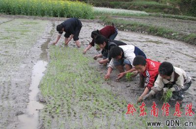 岑鞏縣平莊鄉的一群留守學生義務在田地里插秧。