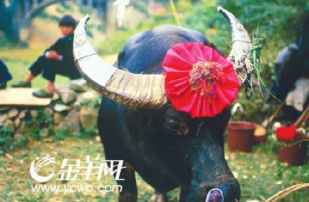 參賽牛頭上都頂著一朵大紅花,活像新郎迎親