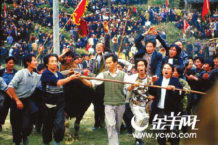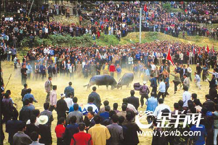那天是農(nóng)歷九月初十。每年三月或九月初十,都是當(dāng)?shù)孛缱宓亩放H�。在農(nóng)村長(zhǎng)大的我,小時(shí)候也看過(guò)牛打架,沒(méi)過(guò)幾招兒,不是一只走開了,就是另一只給牽走了。除了虛驚一場(chǎng)外,實(shí)在談不上有什么看頭。頂多相互打個(gè)照面,就完事了。有人起哄說(shuō):拉了兩兄弟來(lái)當(dāng)然打不成啦!