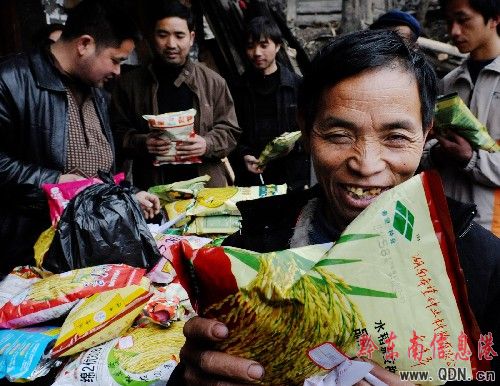 3月13日,久吉村苗族農(nóng)民里莫久扛高興地在村頭購買優(yōu)良雜交稻種。