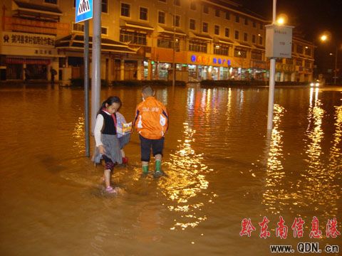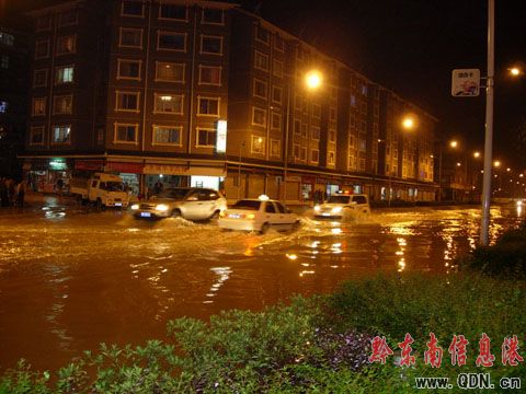 接到群眾報告后,縣城管局、環衛站等部門迅速組織人員疏道清理街道各下水道口,確保洪水排泄。經30余分鐘的奮戰,城區水位逐漸下降,交通恢復正常。圖為縣城仰阿莎大道成“河流”的情景。