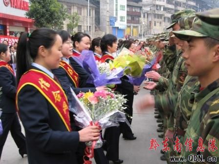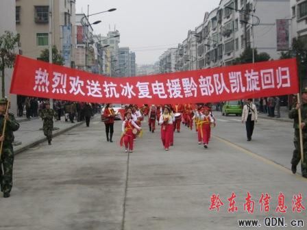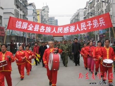 2008年3月4日,錦屏縣各族人民熱烈歡送來該縣抗冰復電的解放軍成都軍區某援黔部隊。
