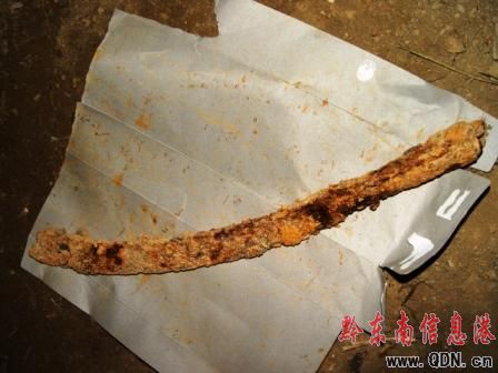 據村民介紹,刀具是日前在修建東莊至俾把兩村之間的公路時發現的。刀身長28.2cm,柄長10cm,刀寬4cm。當場一開挖掘機的外地老板出5000元給該村民,他卻不賣。記者在村民家中看到,出土的刀具被黃土包裹著,已經銹跡斑斑,上面的紋理和其他符號很難辨認。(圖為出土刀具)