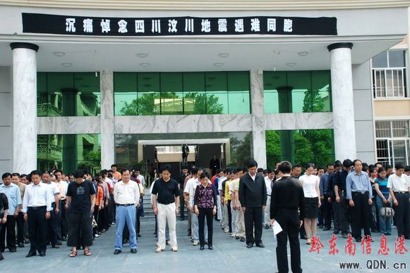 19日14時28分,錦屏縣黨政機(jī)關(guān)300余名干部在縣政府辦公樓前為四川地震災(zāi)區(qū)遇難同胞默哀。(楊勝屏 攝)