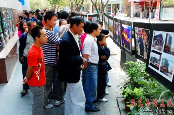 本港訊 10月23日,錦屏縣城三江路人行道旁邊100多米路段,用繩子懸掛著90厘米寬的100幅“魅力錦屏”攝影作品展。攝影作品在街頭的展出方便了過往群眾住足觀賞。圖為群眾在街頭觀看影展。