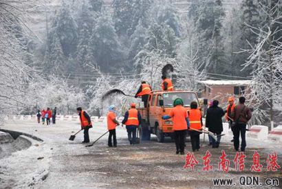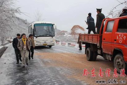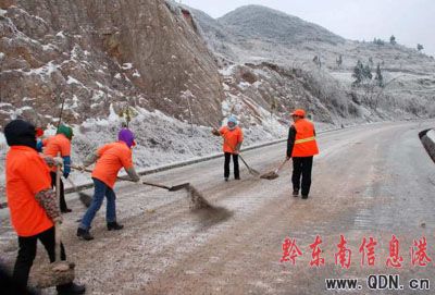 1月22日,由于連日出現凝凍天氣,黔東南州其境內的兩條國道、5條省道和高速路公路路面因結冰嚴重,全州15個縣(市)之間的公路交通完全中斷。為使駕乘人員盡快走出困境,黔東南州公路交通部門組織公路管理人員和機械設備,冒著惡劣天氣,在所有危險路段的路面采取灑鹽、鋪上防滑,解救被困車輛,路政車開道等措施,把被困在公路上的車輛護送到安全區。據當地氣象臺預報,本月25號之前,惡劣天氣在進一步加劇,黔東南州公路交通仍面臨著嚴峻的考驗。1月22日,