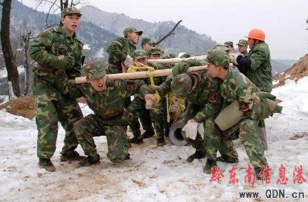 搶修就是搶時間!在現(xiàn)場,記者看到子弟兵們一擁而上,綁的綁,抬的抬,齊聲吆喝著抬運電桿。這支平均年齡22歲的隊伍,高喊著激昂的口號,硬是把一棵棵電桿像螞蟻抬蚯蚓一樣從山腳抬運到山頂,扶著電桿向桿基移去。