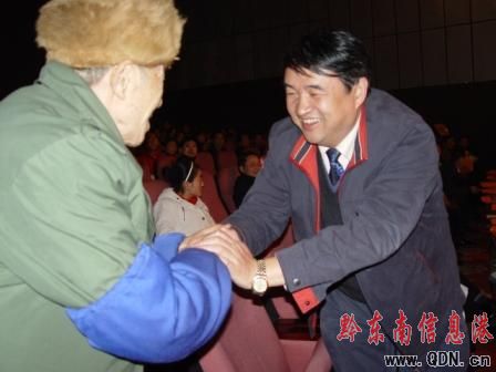 從自己的養老金中拿出1000元捐給災區人民的老大爺在臺下受到了州委書記廖少華的親切握手