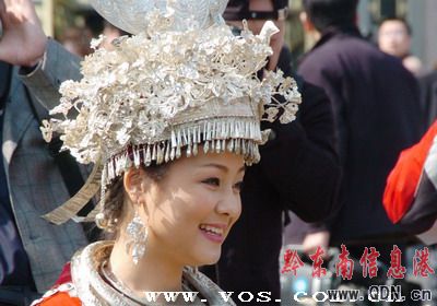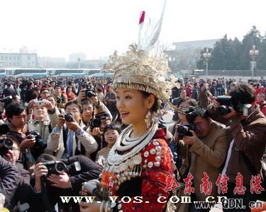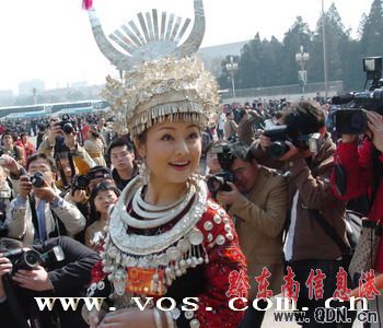 人大代表雷阿幼朵:對,馬上要到人民大會堂去,這是我們的節日盛裝。今天是三八婦女節,我們車上有各族各界的女代表,我們很高興,大家歡迎我們貴州著名苗族歌手阿幼朵,在三八婦女節的時候給大家獻上一首歌。
