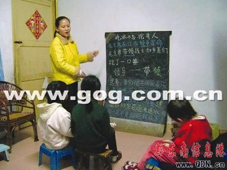 3月6日下午,記者根據當地群眾的指點找到蒲祖烈的家。推門而入,只見一位女子正拿著教鞭指著黑板上的字領誦:“吃水不忘挖井人……”在她面前不遠處,坐著兩個小女孩,她們手上拿著一年級語文課本,眼睛盯著小黑板,跟隨她念著黑板上的字。蒲祖烈說,那位她是他的妻子楊錦蓉,兩個“學生”是他們的女兒。