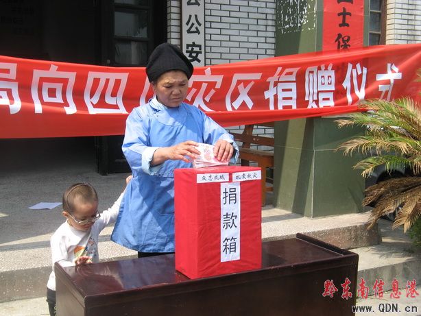 “老歐(歐光權)在雪凝災害中犧牲時,我們一家得到了社會各界的關心和照顧,現在四川人民受災了,自己雖不是警察,不能親赴抗震救災第一線,但作為民警的家屬,我相信他在天之靈一定會向危難的災區人民奉獻自己的一份力量,提供力所能及的幫助和支持”,“他們的痛苦就是我的痛苦” 這是全國公安二級英模歐光權同志的妻子歐夜福女士第二次向地震災區捐款2000元時流淚說的話。日前,從電視上看到汶川地震的情況后,全國公安二級英模歐光權同志的妻子歐夜福女士,把對愛人的思念深埋心底,把對親人的牽掛奉獻給災區,前后兩次向地震災區人民共捐款5000元。圖為全國公安二級英模歐光權同志的妻子歐夜福女士在向汶川地震災區人民捐款(楊航)