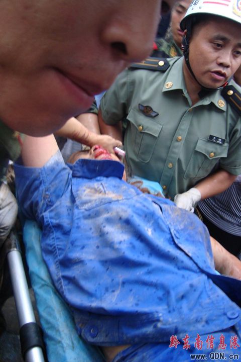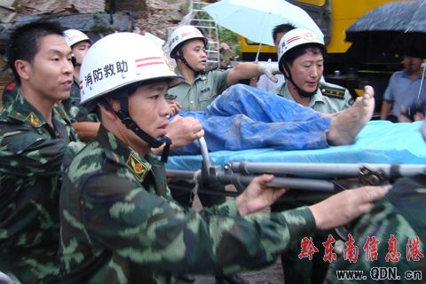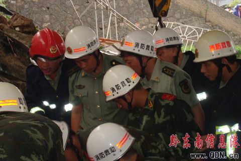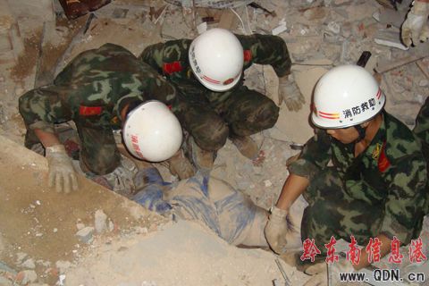 17時(shí)35分,現(xiàn)場(chǎng)指揮部考慮到預(yù)防發(fā)生二次塌方,還有上側(cè)民房連帶倒塌發(fā)生更大的事故,為了更快救出被埋人員,王國(guó)利支隊(duì)長(zhǎng)在現(xiàn)有的救援器材基礎(chǔ)上,立即報(bào)告州、市政府領(lǐng)導(dǎo)及相關(guān)部門調(diào)來(lái)大型吊車和設(shè)備。在突擊隊(duì)員用特勤器材剪斷裸露鋼筋后,用吊車一層層的將垮塌的水泥預(yù)制板挪開,然后官兵們鉆進(jìn)狹小的縫隙內(nèi)與被埋壓人員喊話溝通,得知被埋人員神志清醒,負(fù)責(zé)一線指揮的鐘文祥副支隊(duì)長(zhǎng),立即增派人員一方面做好埋壓人員的心理安慰和鼓勵(lì),確定被埋人員位置,另一方面利用液壓擴(kuò)張器、鋼筋速斷器、液壓頂?shù)忍厍诠ぞ呒涌焱诰蜻M(jìn)度,在18時(shí)45分壓在被埋人員身上的預(yù)制板被解體吊起,第一名被埋人員成功救出。