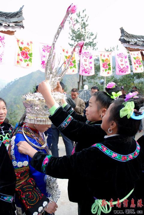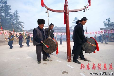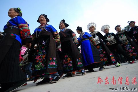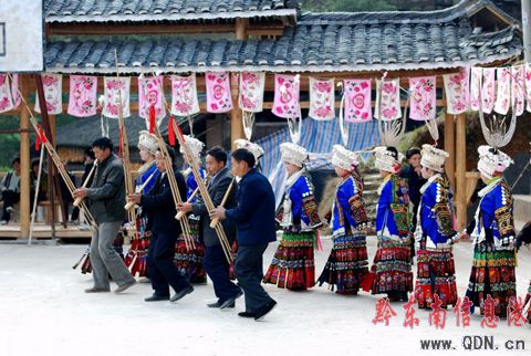 2008年11月25日,凱里市三棵樹鎮附近十村八寨的1000多名苗族同胞匯聚在老鴉村苗寨舉行民族銅鼓舞、蘆笙舞、對唱苗歌等豐富多彩的民俗活動歡送一年一度的苗年。(陳沛亮 攝影報道)