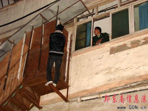 當晚8時許,當地消防隊員趕到現場處置,這名20多出的逃避警方抓捕的男子,正站在某網吧三樓樓梯外,稍不注意就有墜落而下的危險,且現場聚集了大量圍觀群眾,極有可能因為男子的墜落發生次生事故。