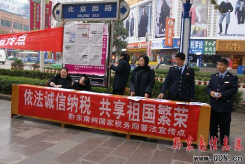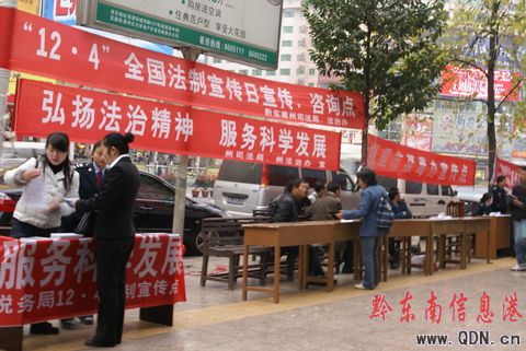 12月4日,凱里市大十字中心集中開展法制宣傳活動,設立宣傳咨詢點為群眾答疑解惑。司法局、州法治辦、州國稅局、州檢察院、州公安局、州林業局、市教育局、市禁毒辦、大十字街道、人事勞動和社會保障局等各部門的工作人員向市民發放各方面法律知識宣傳手冊,提高市民的法制觀念和依法自我保護的意識。為促進城市建設,構建社會主義和諧社會,營造良好的法制環境。(楊懿 攝影報道)