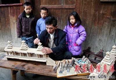 黔東南苗族侗族自治州黎平縣肇興鎮有一位有名的木雕藝人叫龍世興,他的拿手絕活是用木頭雕刻侗家風雨橋。仔細看看眼前這一個個雕刻精致的工藝品,它把小小的侗寨與大千世界連為一體。(記者 彭年/攝)