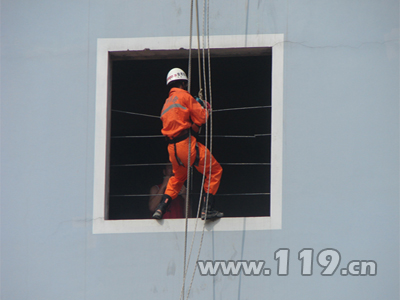 現(xiàn)場指揮員立即派出偵察小組展開火情偵察,并命令戰(zhàn)斗小組進行掩護,在得知火勢的具體發(fā)展情況和人員受困位置后,指揮員當機立斷,命令由戰(zhàn)斗小組設(shè)置水槍陣地控制火勢,救援小組上至頂樓,實施懸垂下降救人。戰(zhàn)斗行動隨機展開,救援小組得到命令后,憑借嫻熟的技術(shù),臨危不懼,迅速利用結(jié)繩法和鋼筋速斷器等先進裝備,降至被困人員外墻,懸空作業(yè),破拆密封的防盜窗,隨著幾聲聲響,消防官兵為被困人員開辟了一條救生通道,并在消防官兵的指導(dǎo)下,被困人員安全跳到早已鋪好的救生氣墊上。而另2名被困人員也在消防官兵的有序組織下,利用大繩斜下成功獲救。隨著指揮員總攻命令的下達,水龍飛舞,熊熊大火在消防官兵織強大的水槍下漸漸熄滅。