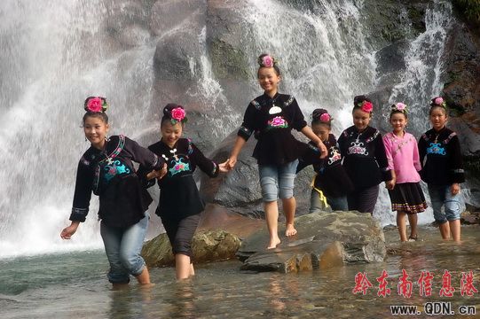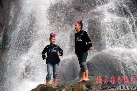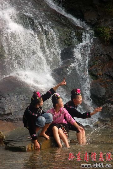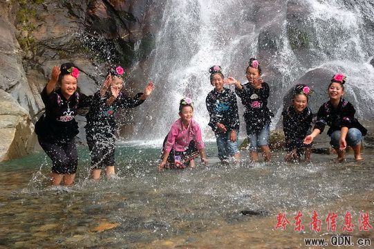 本港訊 6月8日,幾名苗族少女在瀑布前嬉戲。黔東南州雷山縣西江鎮開覺苗寨的一處森林中藏有一條名叫野榮溪的溪谷,溪谷由許多不同落差的瀑布群組成,吸引眾多游客前去游覽。(吳如雄 攝)