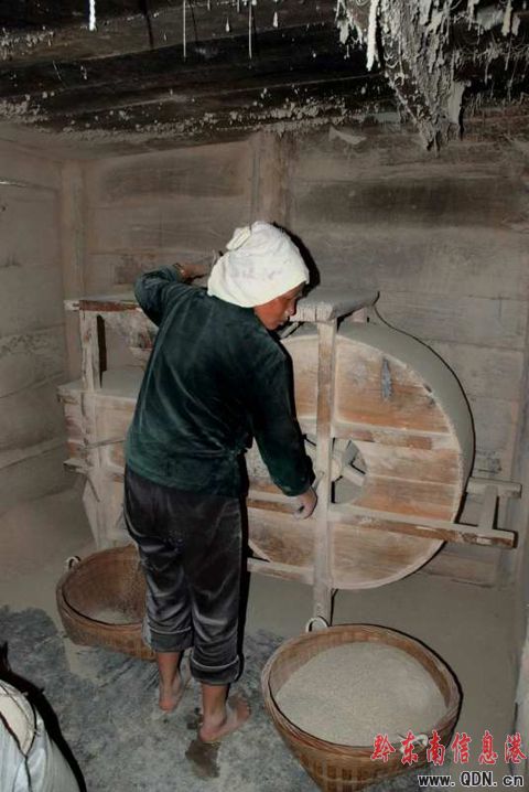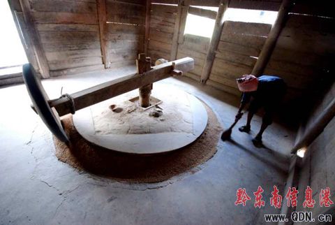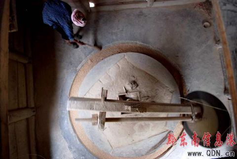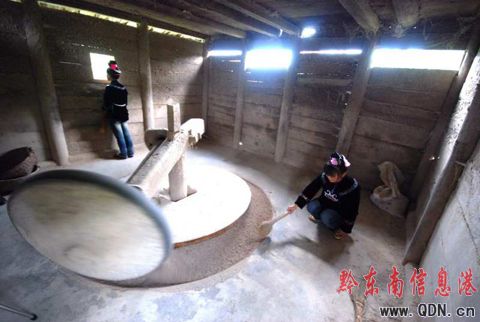 雷公山腹地的雷山縣丹江鎮烏東苗寨有兩座古老水碾坊,為全寨苗族同胞加工大米、小米等糧食。雖然寨里有電力大米加工機器,但苗族同胞卻鐘情使用這兩座老水碾坊,他們認為水碾坊加工加工出來的大米質量、口感好,用糠喂豬豬喜歡吃,省電又環保。圖為8月10日,苗族同胞在雷山縣丹江鎮烏東苗寨水碾坊里加工大米。(陳沛亮攝 )
