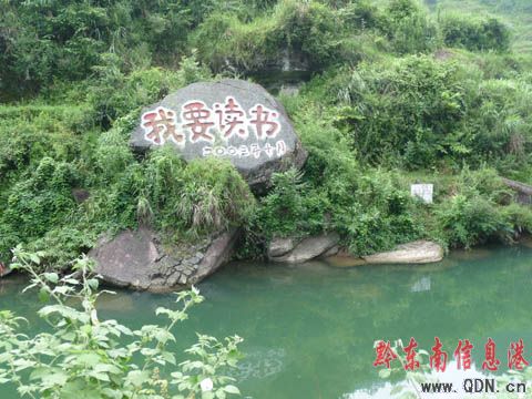 盛夏時節(jié),驅(qū)車來到309省道29900米處,隔河望去,對岸一巖石上“我要讀書”四顆大字非常扎眼。此標(biāo)語不僅為峽谷山美、水清石奇的河流增添了一道亮麗的風(fēng)景,還發(fā)揮了“兩基”迎“國檢”工作的宣傳作用。