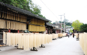 麻江縣下司鎮不長的一條街上竟然云集面條加工廠40多家,戶均日加工面條六七百斤,每逢晴天,家家都把面條拿到門前來晾曬,形成下司很有特色的面條一條街。11月4日,記者在這里了解到,由于具有一定規模,下司面條廠打出品牌,除丹寨等附近縣市,都勻、福泉等地的客商都定點在這里購買,特別是用本地小麥加工的面條供不應求,帶動了當地群眾種植小麥的積極性。
