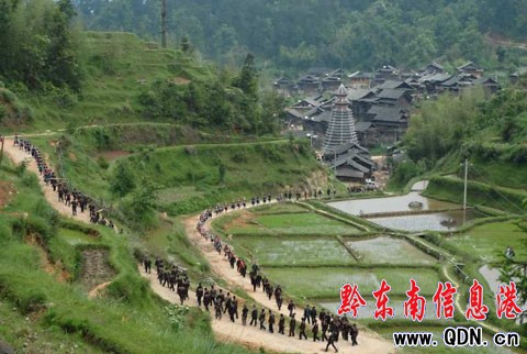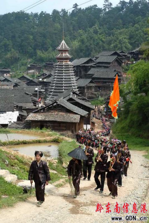 本港訊(楊通榮 特約記者 陳沛亮攝影報(bào)道)2009年5月15日,從江縣慶云鄉(xiāng)數(shù)千名侗族同胞在百你村舉行“迎薩節(jié)”祭典活動(dòng),“迎薩節(jié)”是慶云鄉(xiāng)侗族遺存最古老、盛大的民俗傳統(tǒng)節(jié)日。一般在數(shù)十年才舉行一次,以此紀(jì)念侗族“薩瑪”即“大祖母”這位侗族人民心中仰慕的女英雄,祝愿村寨平安、人畜興旺、五谷豐登。圖為當(dāng)日眾多侗族同胞走出從江縣慶云鄉(xiāng)百你村村頭去“迎薩”的山路上、吹奏蘆笙等舉行 “迎薩”活動(dòng)。