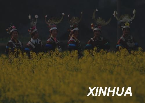 2月24日,苗族女子走在油菜花盛開的田野上,前往南皋村參加“看會節”。