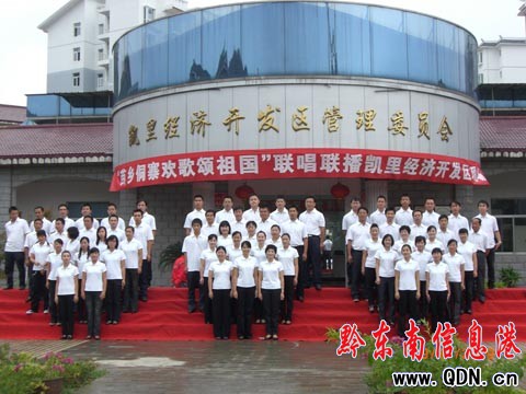 本港訊 (倪俊京)在全國上下紛紛為祖國慶祝60華誕之際,9月16日,在開發區管委、工委組織下,由全區19家行政單位代表組成60余人的合唱隊在開發區進行主題為“苗鄉侗寨歡歌頌祖國”聯唱聯播歌唱活動。圖為活動歌唱活動現場。