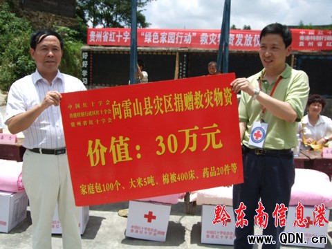本港訊 ( 歐品玲 特約記者 張希才 攝影報道) 7月14日,貴州省紅十字會何淑華處長一行在州紅十字會、州衛生局相關領導的陪同下,帶著中國紅十字會、香港特別行政區紅十字會、貴州省紅十字會一片愛心,專程到雷山縣開展向災區捐贈物資價值30 萬元的大米 5 噸、棉被400 床、藥品20 件、家庭包 100 個等物資。其中:向大塘鄉高巖村、水溪村80戶災民捐贈大米900公斤,棉被60床、家庭包20個、藥品6件。價值15000元。