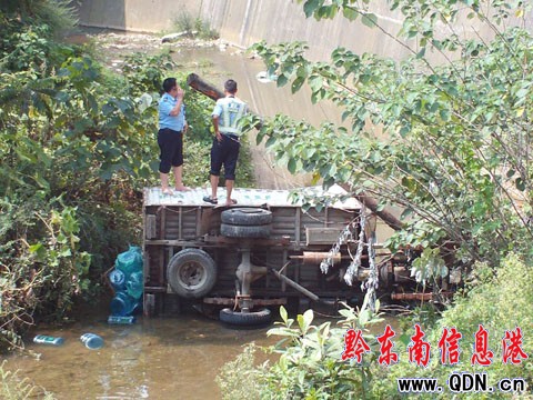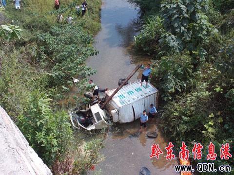 據(jù)現(xiàn)場目擊者稱,事發(fā)時,肇事車輛正沿國道線向凱里市行駛,為了躲避一輛掉頭的三輪車,車身失控,沖上人行道,撞翻了行道樹,最后墜下了12米的高坎,翻倒在路邊的河道當中,駕駛員當場死亡。