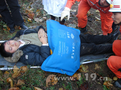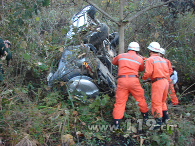 08時41分,消防官兵到達現場后迅速展開偵察。經詢問知情人得知,越野車由于急轉彎時駕駛員操作不當,墜下20米高的山坡,其中1人已自行鉆出車外,駕駛員則被卡在車內。在了解事故情況下,消防指揮員果斷下令,由2名消防官兵利用大繩固定越野車車身,防止越野車移動或者再次下滑給駕駛員造成二次傷害,其余消防官兵用人力將車身抬起,騰出足夠的空間進行施救。經消防官兵緊急施救,8時56分,消防官兵成功將被困駕駛員救出并送上120救護車進行急救。
