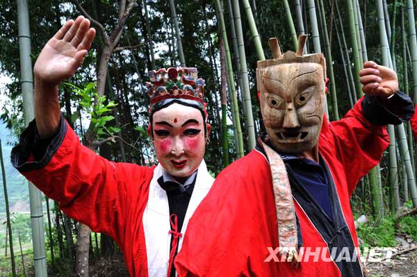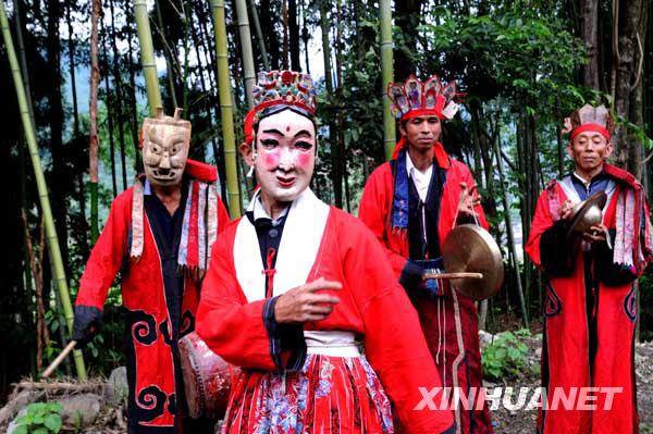 5月24日,貴州岑鞏民間儺戲藝人在竹林間進行儺戲表演。
