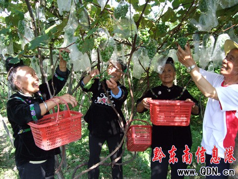 本港訊 (特約記者 張希才 攝影報道)仲夏時節,被稱為“苗家葡萄村”的雷山縣丹江鎮郎當村,一叢叢連起的大葡萄園像是一個龐大的綠色珍寶在習習生輝。全村205戶的150畝葡萄架上,綠葉蔥蘢、碩果累累,散發出一陣陣葡萄的芬芳,醉人心扉。今年,該村葡萄長勢勝似往年,預計產量可達9.375萬公斤,產值37.5萬元,戶均收入1829元。村會計李金瓊接受筆者采訪時說,她家種4畝葡萄,按每畝收入2500元計,收入達1萬元。