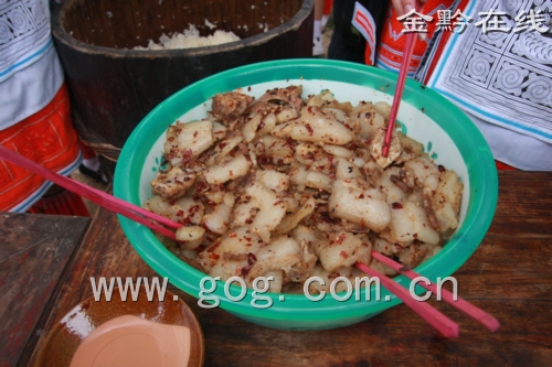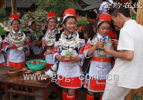站在山坡頂上,往任何一個(gè)方向看幾乎都是一片迷離,亻革家村寨就坐落在這里。走到村寨口,我們接受了亻革家人最真摯的迎賓禮。亻革家人迎賓有三道關(guān),喝酒、吃肉、吃糯米飯。最有趣的是喝完酒以后,亻革家人也會(huì)像附近的苗族人一樣在游客額頭或兩頰用紅色上一個(gè)大大的印記。