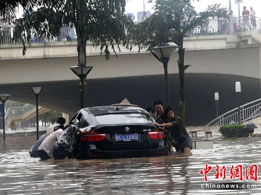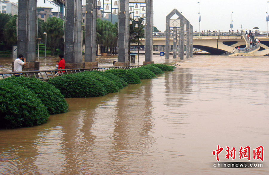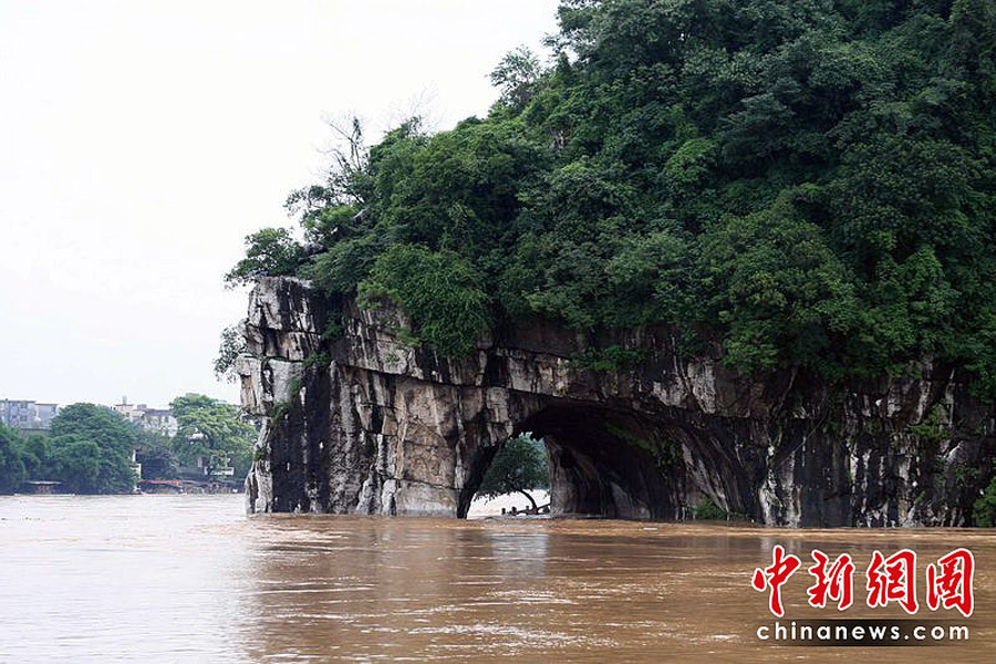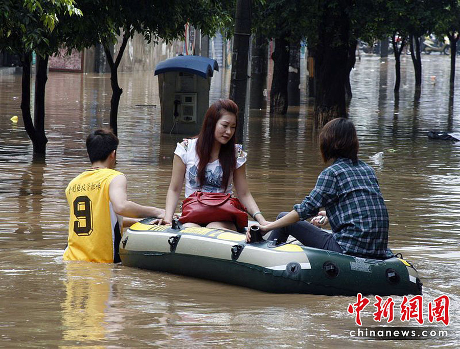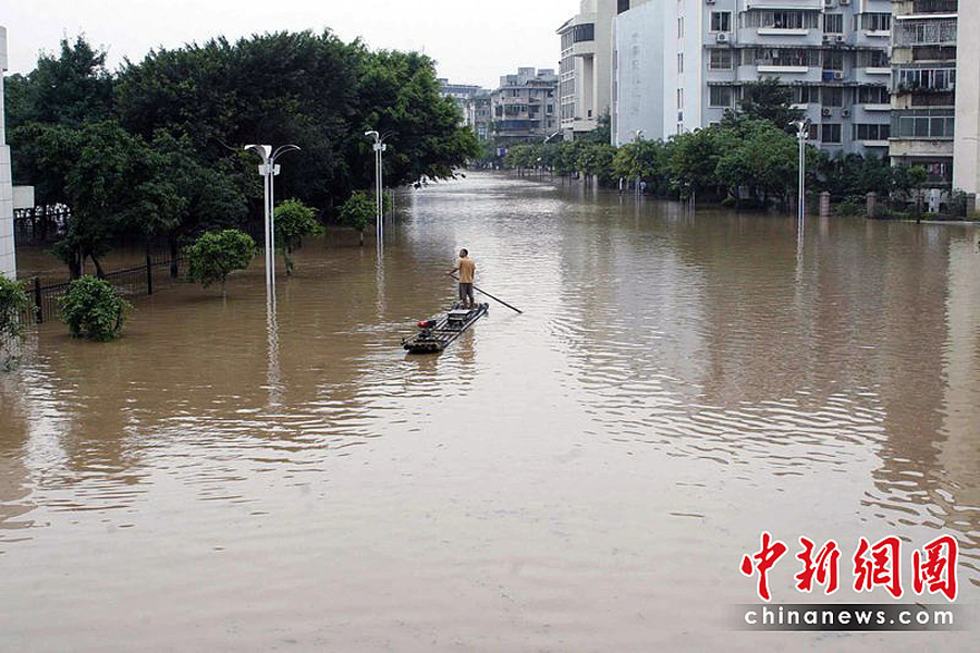 2010年6月17日,廣西桂林市出現大到暴雨、局部大暴雨天氣。漓江洪水倒流入市區,市民坐竹排出行。