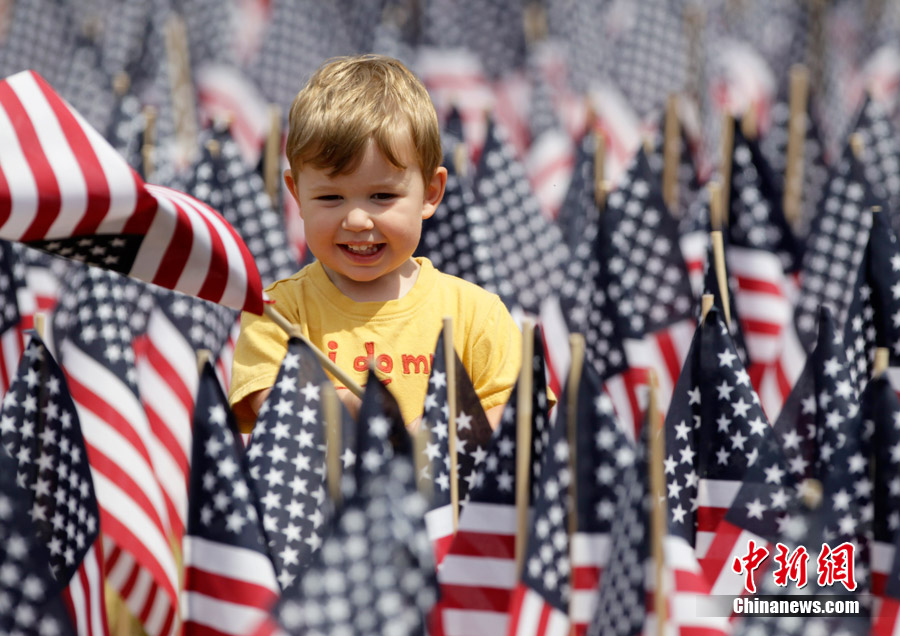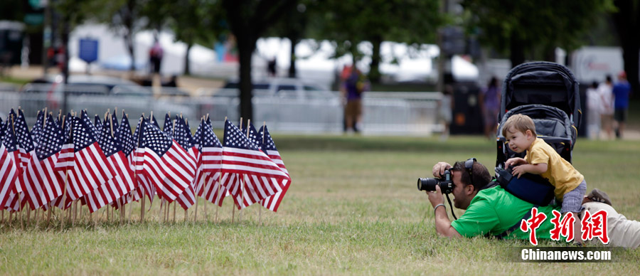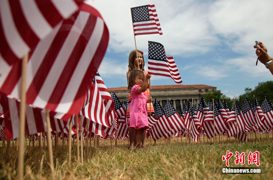 2010年6月30日,美國華盛頓,環保組織塞拉俱樂部的成員將數千面美國國旗插成“擺脫石油”(Freedom From Oil)的字樣,抗議墨西哥灣漏油事件。