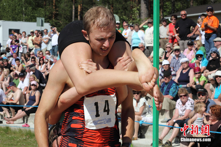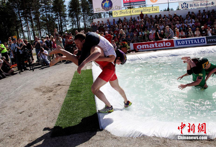 7月3日,一年的一度的世界背老婆大賽在芬蘭中部小鎮松卡耶爾維舉行,參賽者背著自己的老婆在泳池里行走,最終來自芬蘭的一對選手最先通過終點。
