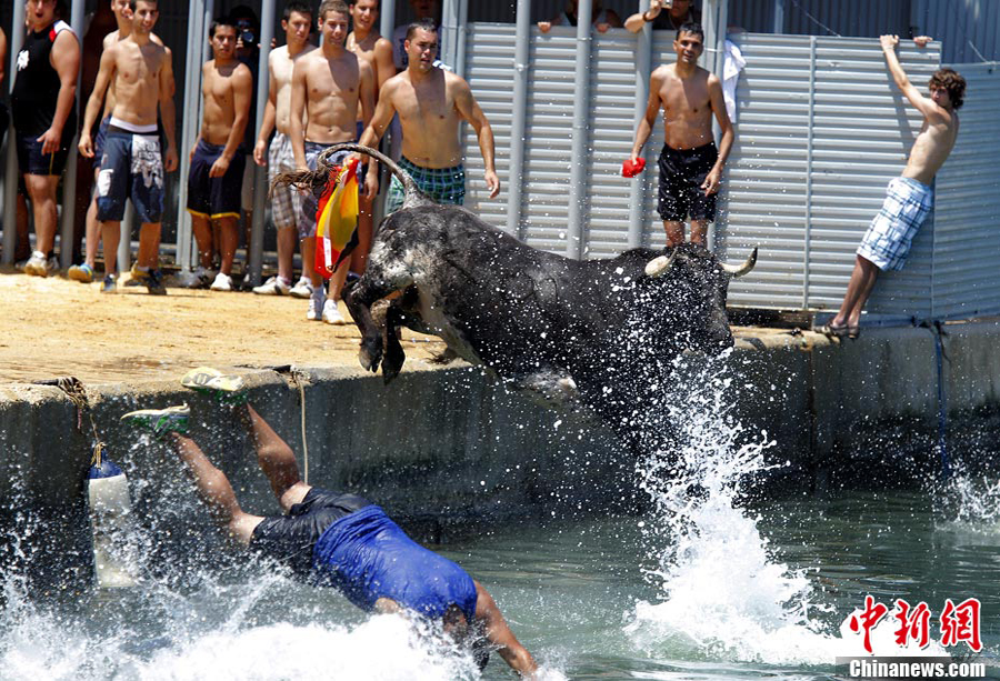 西班牙海邊斗牛盛事“奔牛入海”