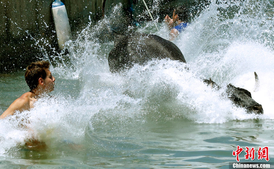 7月5日,西班牙東部德尼那小鎮一年一度的海邊奔牛節再度舉行。這里的奔牛節與眾不同,斗牛士們挑逗著一頭頭暴躁的公牛跳入海中,俗稱“奔牛入海”場面蔚為壯觀。