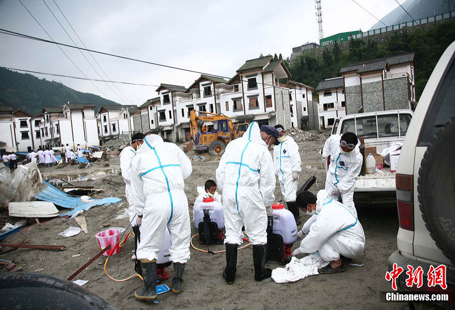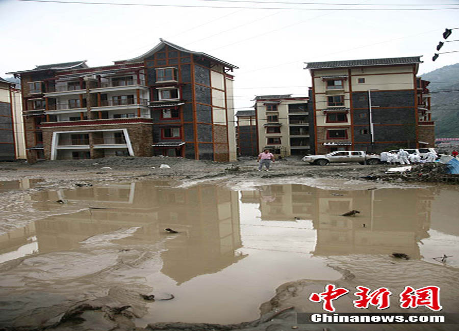 8月18日,經過搶險隊連夜奮戰,汶川泥石流重災區映秀鎮新城水位終于退去,防疫人員、清淤隊伍陸續進入新城展開清潔工作,武警水電三總隊于當日對堰塞體進行第三次爆破。圖為退水后的映秀鎮新城。