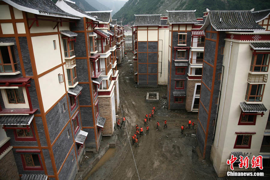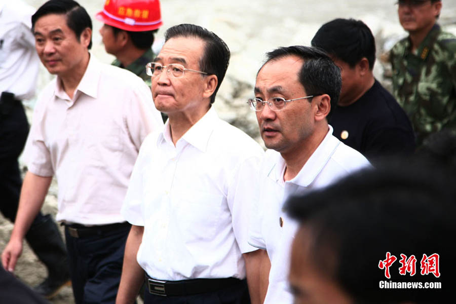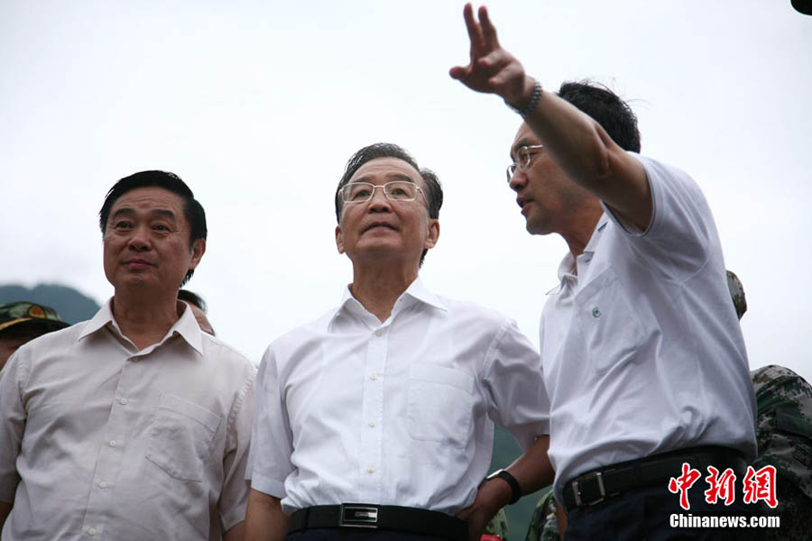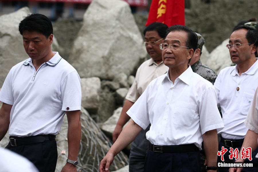 8月23日下午,中國國務院總理溫家寶抵達四川汶川泥石流重災區映秀鎮指導搶險工作,并慰問了參加此次搶險的武警官兵。溫家寶總理于22日中午臨時決定,改變從舟曲返京日程,直飛四川綿陽,指導當地抗洪救災工作。圖為溫家寶在映秀鎮泥石流現場慰問四川消防官兵