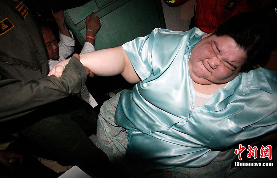 泰國最胖的女子烏努埃蓬(Umnuayporn Tongprapai)于當地時間8月26日在政府派遣的由工程師、拆卸專家、救援隊、醫生和護士組成的救援團隊幫助下“走”出三年未曾離開的住所。44歲的烏努埃蓬住在泰國首都曼谷的郊區,她的體重高達274公斤,被認為是泰國最胖的人。